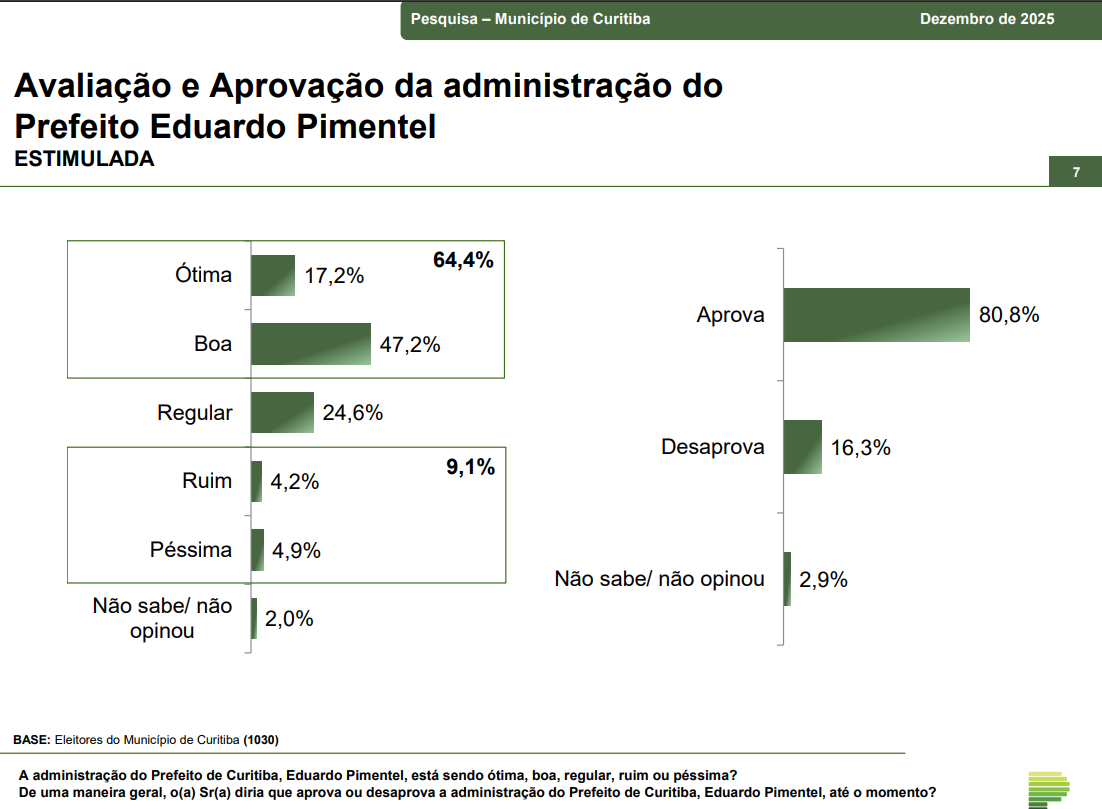 Gestão Eduardo Pimentel fecha 2025 com aprovação de 80,8% em Curitiba