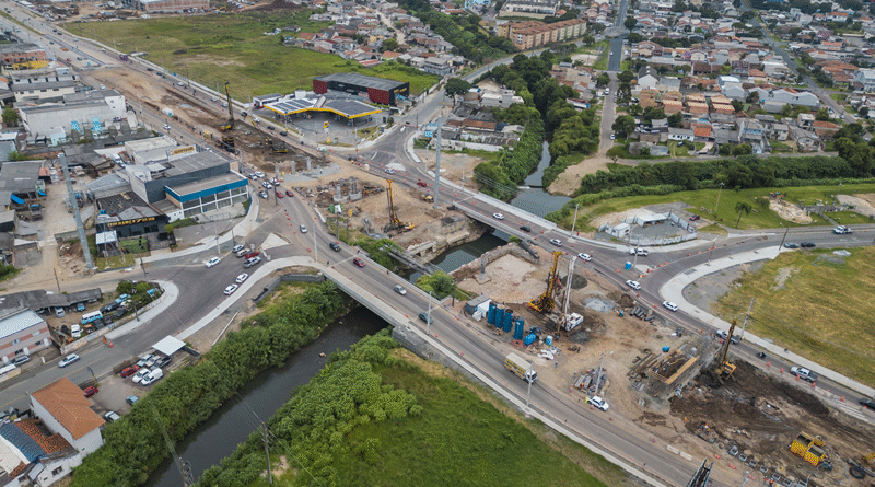 Iniciada em 31 de março do ano passado, a construção do novo viaduto que vai modernizar e ampliar a ligação entre a Avenida Victor Ferreira do Amaral, no Tarumã, e a Rodovia João Leopoldo Jacomel, no município vizinho, está seguindo em bom ritmo. As intervenções já conferem um novo desenho para a região.