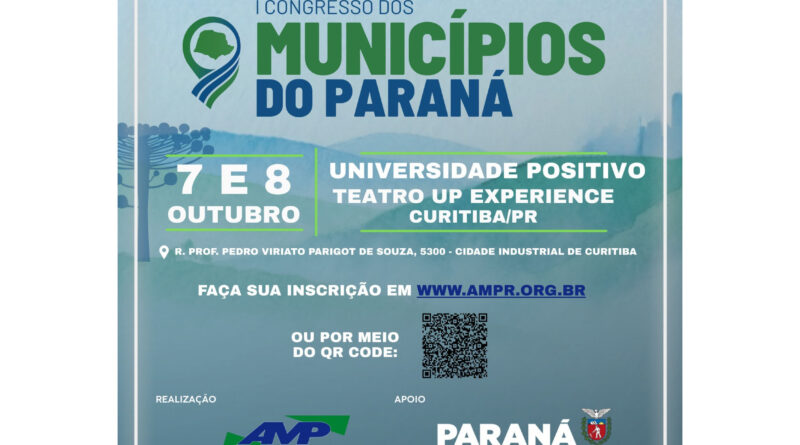 Com apoio do Governo do Paraná, Curitiba recebe na próxima semana, nos dias 7 e 8 de outubro, o I Congresso dos Municípios do Paraná, promovido pela Associação dos Municípios do Paraná (AMP) e Associação dos Municípios da Região Metropolitana de Curitiba (Assomec). O governador Carlos Massa Ratinho Junior vai participar da abertura do encontro. O evento será realizado na Universidade Positivo (Auditório Viasoft Experience).