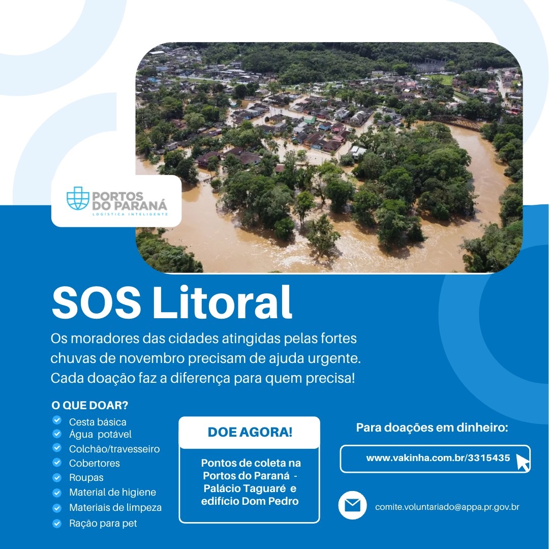 As doações podem ser entregues nos pontos de coleta que estão montados nos prédios do Porto de Paranaguá: Palácio Taguaré e edifício Dom Pedro II. “As famílias precisam, especialmente, de colchões, cobertores, demais roupas de cama, vestimentas, materiais de higiene e limpeza, alimentos e água potável”, lista Garcia.