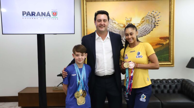 O governador Carlos Massa Ratinho Junior recebeu nesta segunda-feira (25) no Palácio Iguaçu dois atletas paranaenses que têm se destacado internacionalmente nas suas modalidades: a ginasta Bárbara Domingos, que se classificou para disputar as Olimpíadas de Paris de 2024, e o lutador de karatê Igor Samuel Schlosser, campeão mundial na categoria até 11 anos.