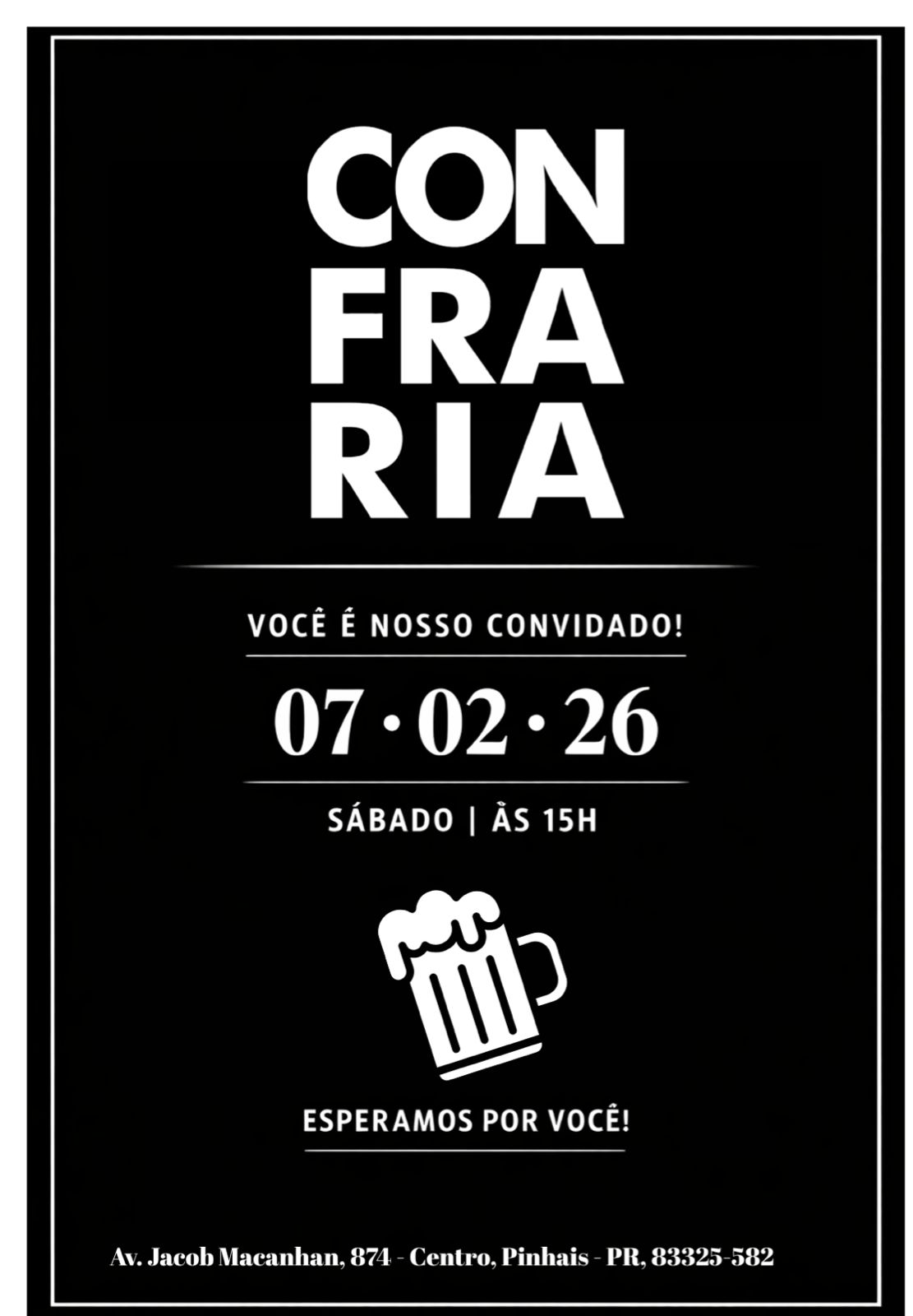 No próximo dia 07 de fevereiro vai ser inaugurado em Pinhais o Confraria. O Bar tem capacidade para atender até 400 pessoas, quando estiver em pleno funcionamento. É o novo bar do Guimarães.